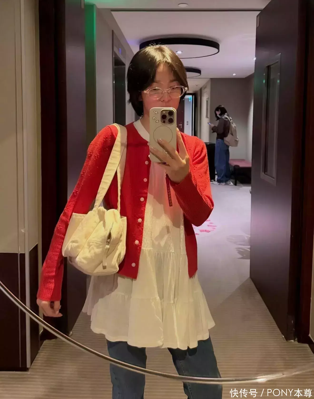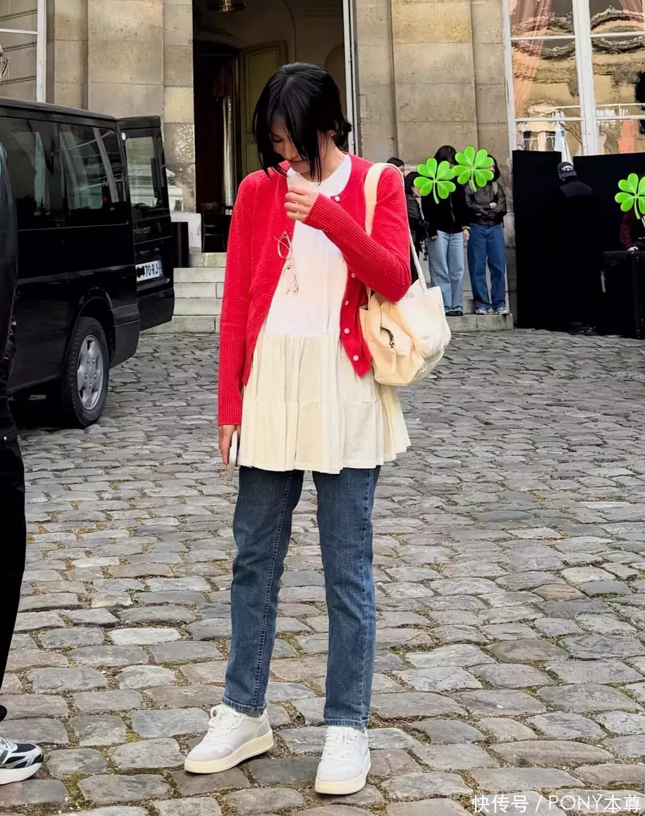 其次,穿搭风格百变!不知道大家发现没有,2026年流行红色针织衫,很多品牌都出了这种颜色开衫,宋慧乔搭配了一款八色短款连衣裙,下半身搭配了蓝色牛仔裤!